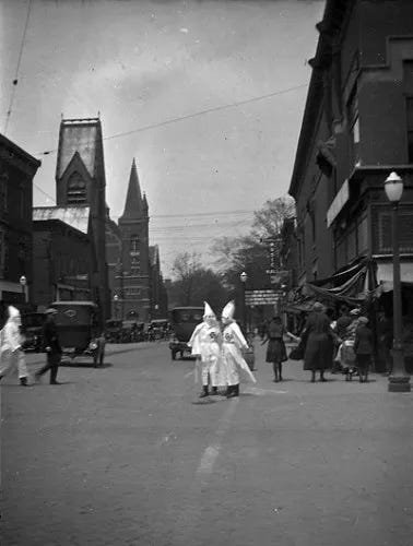 Klan members on Franklin Street in Valparaiso, Indiana, circa 1923 (via Ancestry.com)