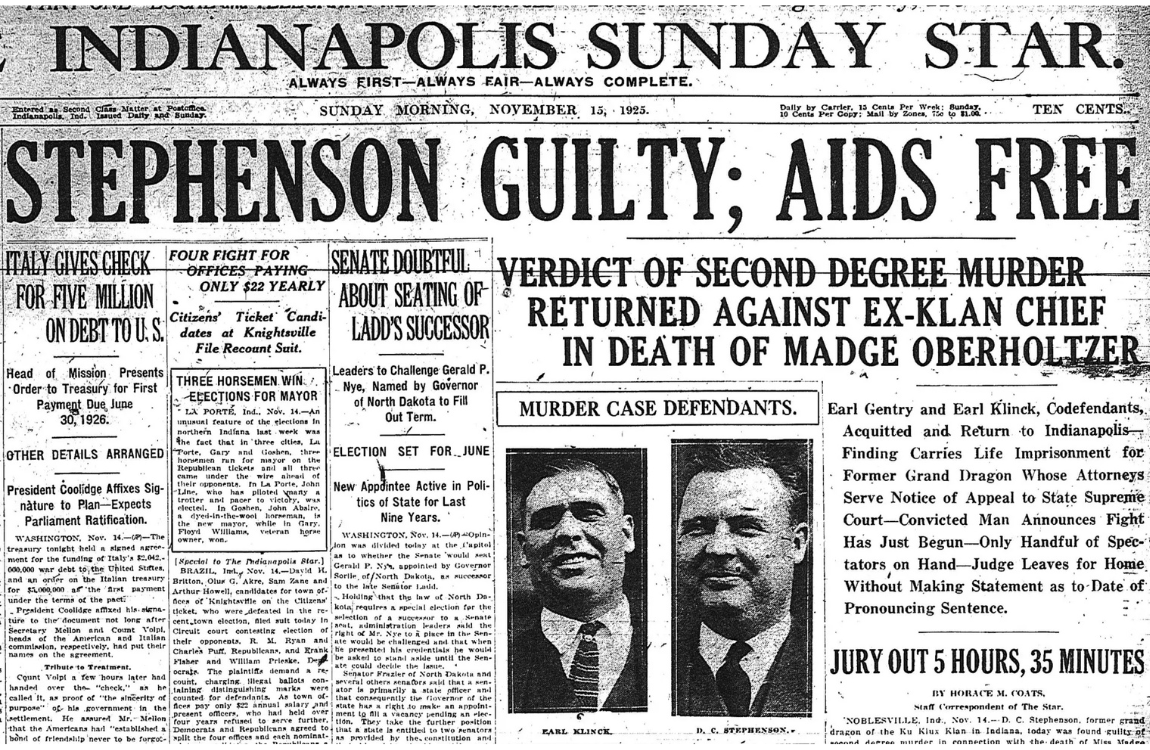 One of the themes in A Fever in the Heartland that translates for me into hope in our current circumstances is that D.C. Stephenson and his evil empire were left in ruins not by power brokers or opposition politicians, but by regular people: an unmarried woman in her late twenties whom Stephenson raped and brutalized so severely that she died after a thirty-day fight for her life, a young and early-career lawyer known around the courts as the boy prosecutor, and a jury of twelve middle-aged farmers. These were all ordinary people who had seen enough and suffered enough and were mad enough to risk being David to this fraudulent Goliath. Their collective courage and persistence brought down the vulgar, violent head of the northern KKK and precipitated what became the radical decline of the pre-MAGA Klan throughout the country. Perhaps it will be such ordinary Americans today who have had enough of this vulgar, violent reign to dare to slay the monster.